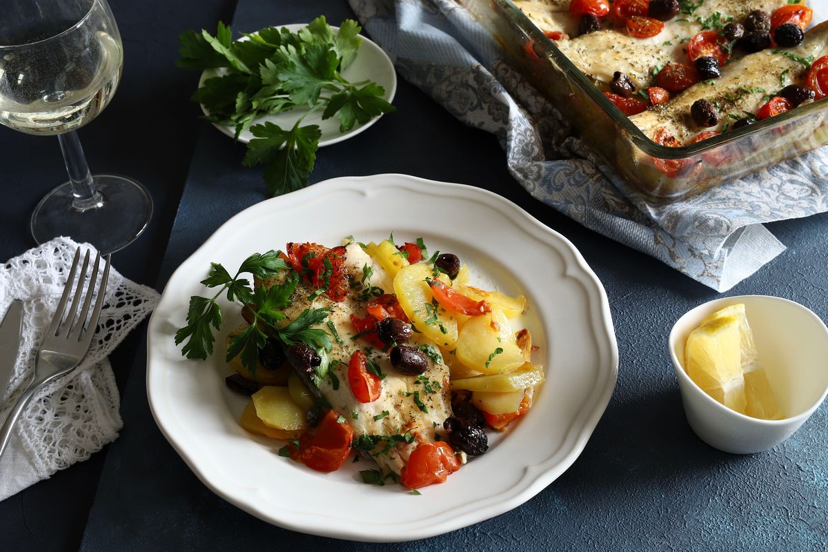 - Arrange the cherry tomatoes and olives on the hake fillets and finish with a sprinkling of dried oregano.