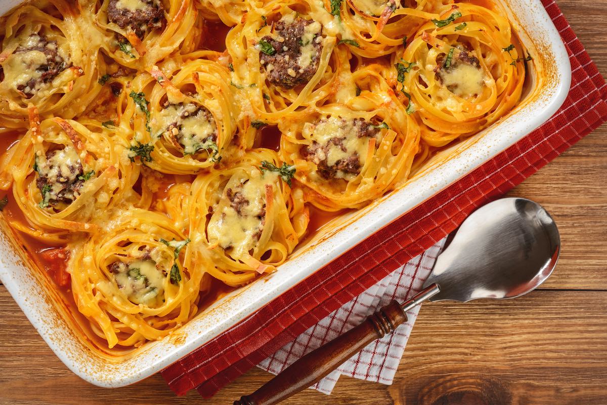Stringy and cooked in meat sauce, baked tagliatelle nests are a quick first course to prepare and perfect for parties.