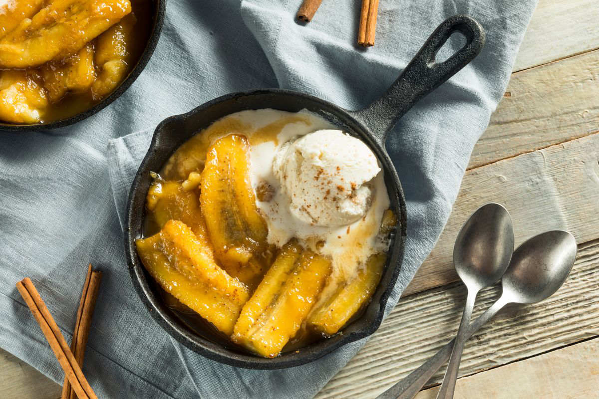 Pan-flambé caramelized bananas served with ice cream and a delicious rum caramelized sauce: here is the banana foster.