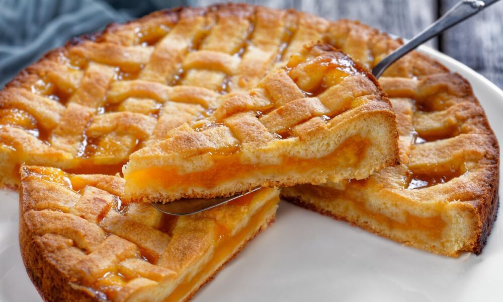 - Pour the jam and level it; then with the leftover dough create decorations as you like: you can opt for the classic grid or make molds with biscuit molds.