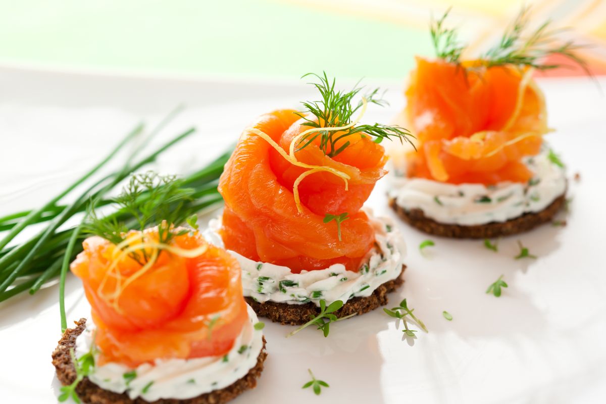 - Now you just have to compose the canapes. Start with a layer of Philadelphia, then lay the salmon slices and finish with chives to decorate.